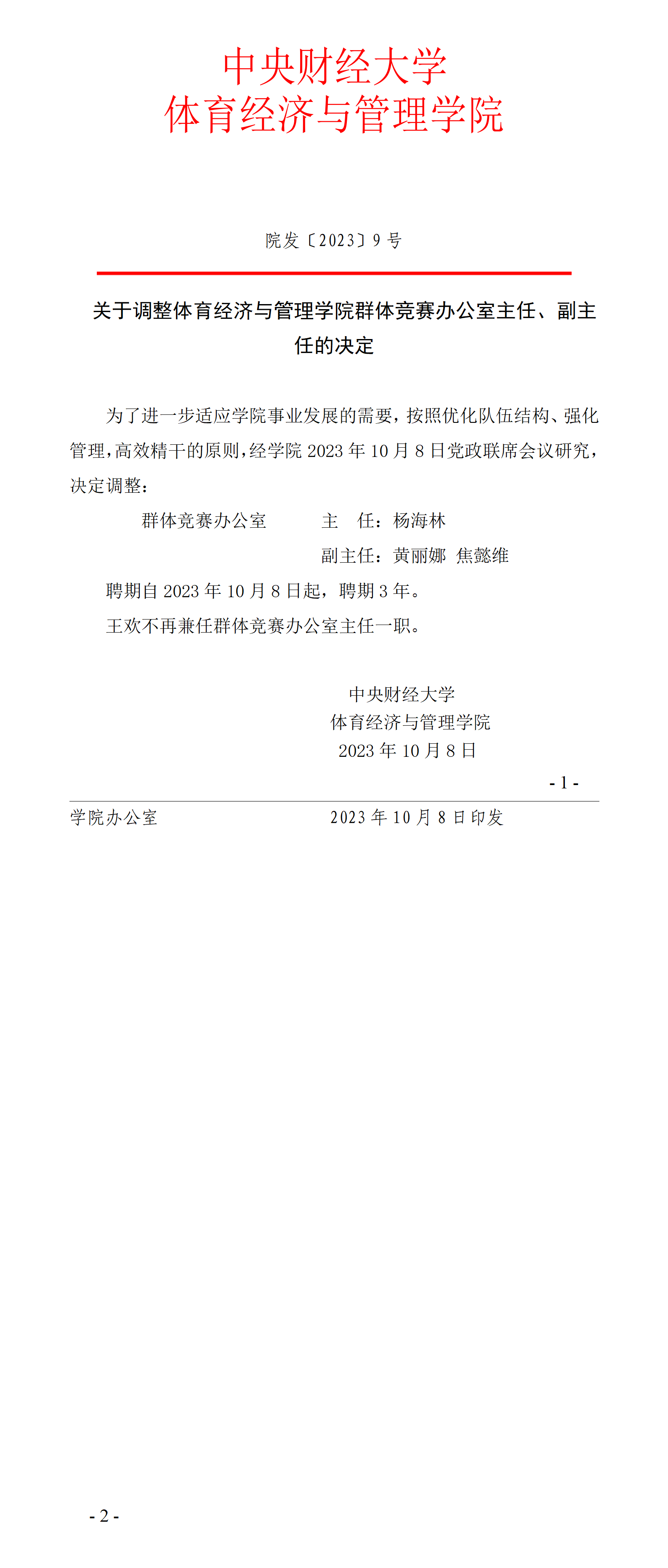 院发〔2023〕9号 关于调整任伟德群体竞赛办公室(非编制)主任、副主任的决定