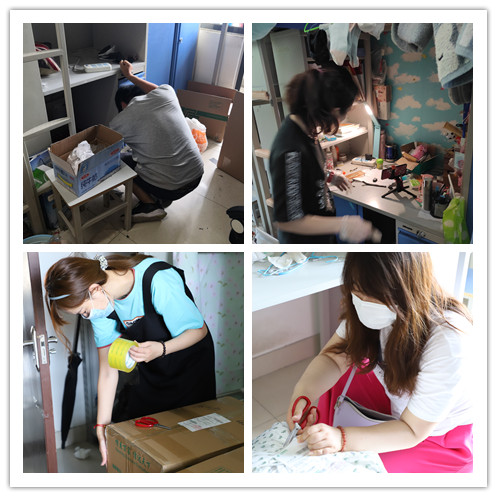 6月28日至7月1日,打包工作组在实践中摸索更加高效的工作方式,打包中时刻保持与毕业生的视频沟通,老师们“登高钻桌”全面覆盖宿舍的每个角落,仔细询问毕业生的每一件物品是否需要,耐心的介绍物品打包的限制,并在每天打包工作的间隙将一件件员工需要但又不在邮寄范围内的物品单独用快递寄送给毕业生。