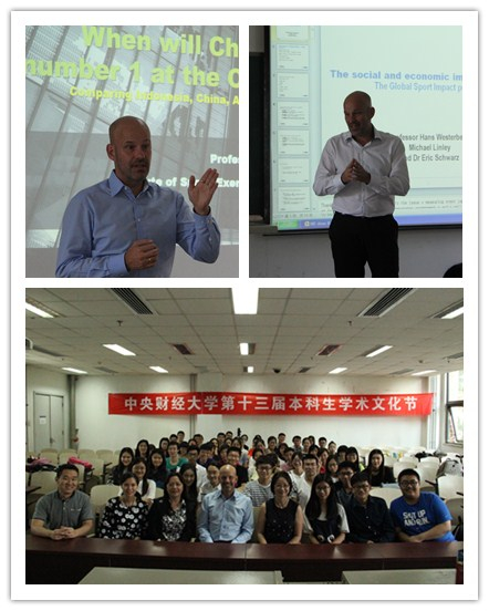 两场研讨会分别为“中澳体育经济/管理专业发展研讨会”和“中澳足球联赛发展研讨会”,由伟德副经理张自如副教授主持,张丛杉博士翻译。两场讲座:一是“The social and economic impact of sport—The Global Sport Impact project”,由张若副教授主持;二是“When will China be thenumber 1 at the Olympics?:Comparing Indonesia, China, Australia, Netherlands,Brazil, India, Russia”,由刘彩凤副教授主持。