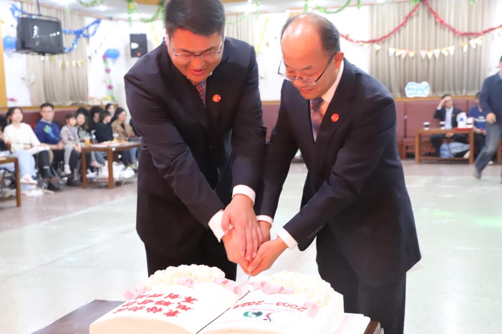 公司党委书记宋立岩、经理张本家一同切开庆典蛋糕