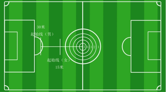 每队15名队员参赛,至少5名女生。每队15名队员在起始线后依次将球踢入规定区域(足球场中圈),各区域赋予不同分值(1-5分),每人三次机会,取15人的三次成绩总和为本队最终成绩,总分高者名次居前。