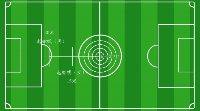 每队15名队员参赛,至少5名女生。每队15名队员在起始线后依次将球踢入规定区域(足球场中圈),各区域赋予不同分值(1~5分),每人三次机会,取15人的三次成绩总和为本队最终成绩,总分高者名次居前。