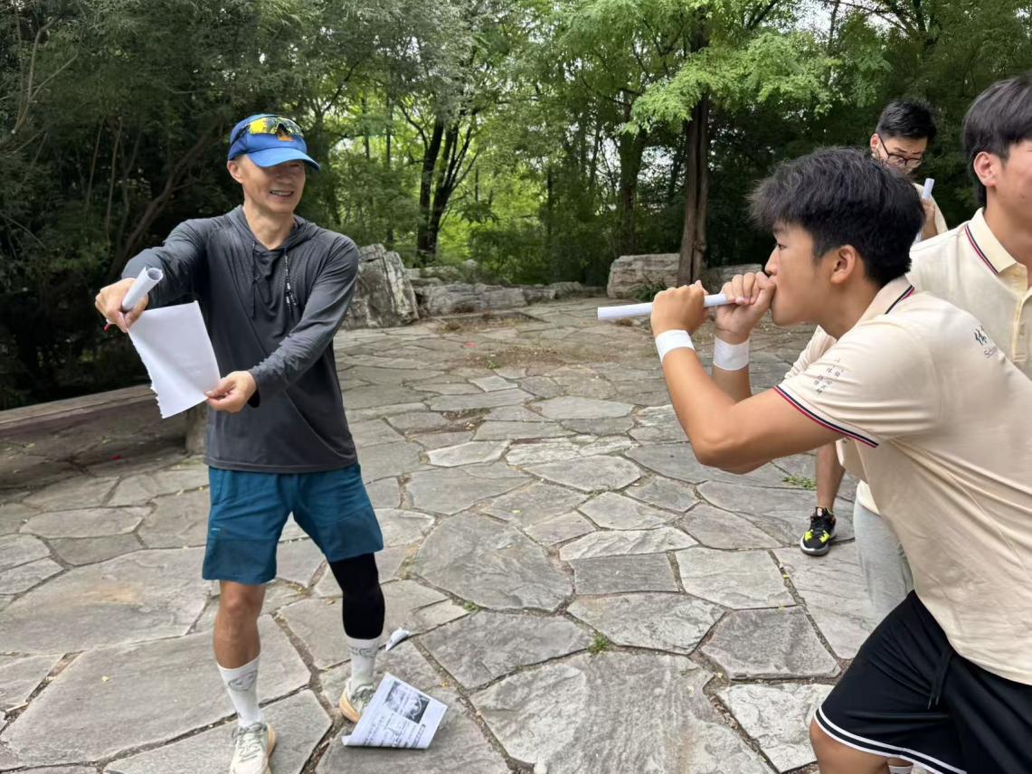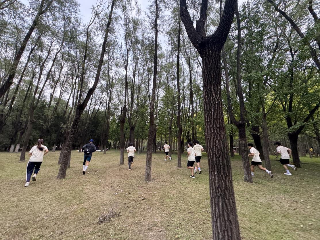 最终,队伍抵达奥林匹克森林公园中轴线区域。在此,老师带领大家进行了一场信任静心实验。老师通过简单且寓意深刻的身体协作小游戏,引导同学们体会信任的力量,即放下戒备、依赖队友,才能真正凝聚成整体。中轴线的开阔庄重,让这一环节更具仪式感和意义。