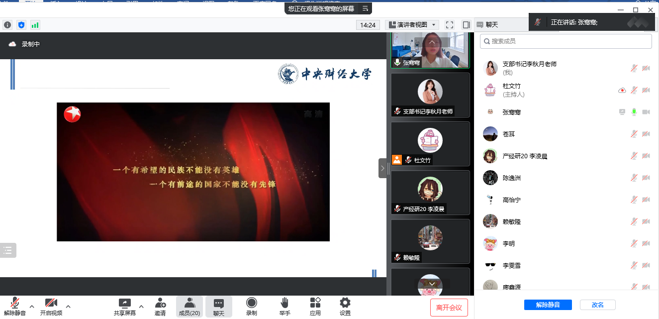 为迎接党的二十大,结合同志们对理论学习的高涨热情,2022年6月1日,公司第一员工党支部及第二员工党支部成员在腾讯会议开展了线上党课学习,党课邀请到研究生院博士生宣讲团成员——马克思主义公司博士生张骞骞师为同志们进行主题为《传承伟大建党精神,争做时代新人》的党课讲授。研究生博士生宣讲团兼具专业素养与家国情怀,以习近平新时代中国特色社会主义思想为指导,授课内容多元、范围广。