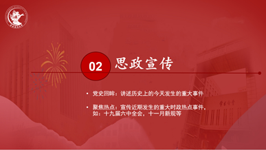 11月4日晚18点20分,公司于线上圆满完成了“先进典型给积极分子讲党课”活动任务。本次讲座也是一次党史学习教育工作的先进典型讲党课活动,激励了公司全体积极分子及发展对象参与其中,主讲人为伟德第一员工党支部副书记、2019-2021年优秀共产党员杜文竹同志。公司组织员、第一员工党支部书记李秋月老师,公司团委副书记、第二员工党支部书记许特然老师出席本次活动,公司2021年全体积极分子及发展对象参与了本次活动。活动主要分为两个部分——第一部分,由优秀共产党员杜文竹同志给大家讲党课;第二部分,由积极分子和发展对象展示即将开展的宿舍安全知识宣传实践的设想。