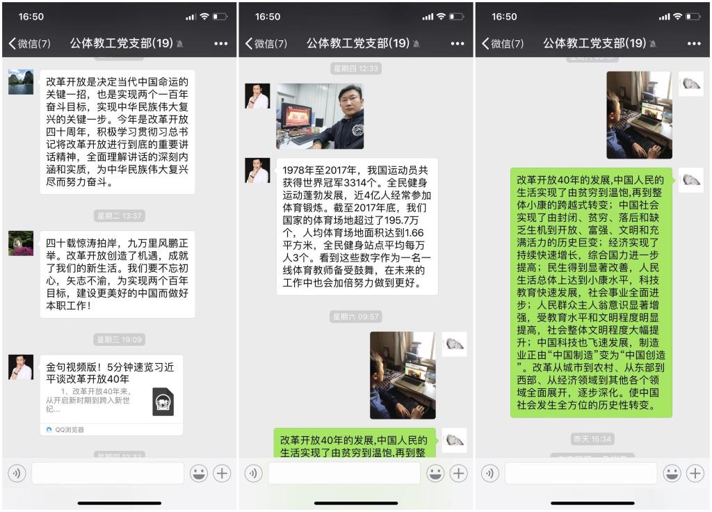 12月18日上午10时,庆祝改革开放40周年大会在北京隆重召开,中共中央总书记、国家主席、中央军委主席习近平出席大会并发表重要讲话。公司师生第一时间通过多种途径、多种形式,观看了大会直播盛况。公司开放了看台209会议室,专业课教工党支部齐聚于此共同观看了直播盛况。有课的教师和员工纷纷通过回放重播的形式观看了此次大会。总书记的讲话和大会传达的精神在公司师生中引起热烈反响和强烈共鸣,师生员工通过面对面或微信群的方式展开讨论,大会精神的学习在公体课教工党支部在微信群内掀起热议。