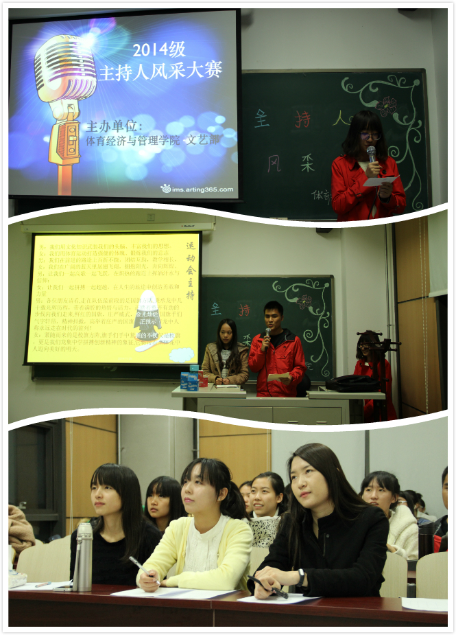 11月28日晚,由伟德主办的主持人风采大赛在东区主教401举行。本次比赛由公司文艺外联部主办,活动面向体经13级全体学员,报名参赛选手共有十四名,并由员工会副主席胡庆、文艺外联部部长花卉、宣传部部长杨婉愉担任评委。活动由14级1班朱旖晨主持。比赛将选出2名最佳主持人,1名优秀主持人。