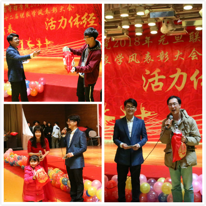 在节目表演过程中,联欢会还设立了三个颁奖环节,为在公司第十二优良学风表彰中获奖的学子颁发奖状和奖品。优良学风表彰旨在表彰先进,引领员工树立更高的学习目标,鼓励全院师生进一步提升学风建设,浓厚学术氛围,丰硕科研成果,提高员工素质。希望受到表彰的先进集体和个人戒骄戒躁,再接再厉,再创佳绩。希望全院各班级和全体员工,以受表彰的集体和个人为榜样,团结奋斗、积极进取、争先创优,涌现出更多的先进集体和个人。同时,联欢会还设立了三个抽奖环节,马楷翔同学、王曼茜同学,张丛杉老师等6名师生成为晚会的幸运儿,抽中了节目组精心准备地新年福袋。