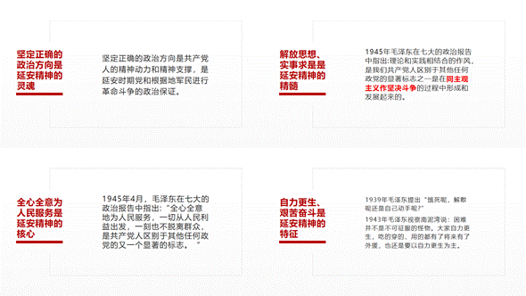 在第二部分,他重点提出延安精神是走向共和国的精神支柱。延安精神是中国共产党人在为争取民族独立和人民解放事业的奋斗中,在延安时期的特殊环境下,培育弘扬的崇高革命精神和优良革命传统。延安精神的精神内涵主要包括:坚定正确的政治方向;解放思想、实事求是;全心全意为人民服务;自力更生、艰苦奋斗。